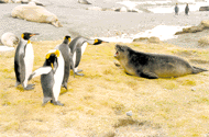 A baby elephant seal "talks" to King penguins on South Georgias Island. The moment was captured on film by a passenger of a Quark cruise to one of the world’s last frontiers.