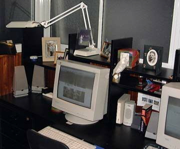 All to quickly he finished and wanted to install it. It looked very impressive and blended in beautifully with the existing desk. I was worried that it would be too high and feel like a bookcase about to fall into my lap, but as always, Ron had done a great job of designing it so that we can have some shelf space above the computers and leave some space to work on the desk below. I happily put up some family pics to make me feel at home.
