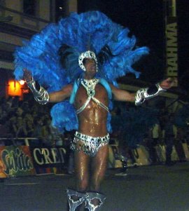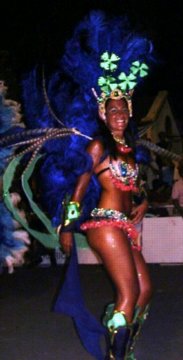 By 10:00 pm the crowds started stamping their feet, waiting for the Carnaval to start. It didn’t take long before the music started and the dancers, performers and floats started slowly going down the procession. Gary thought that we were sitting near the judging area and this seemed advantageous as the performers really seemed to give it their all when they were in our area. It was great being in the front row, being able to see all the sexy outfits, fit bodies and nice butts parading by.