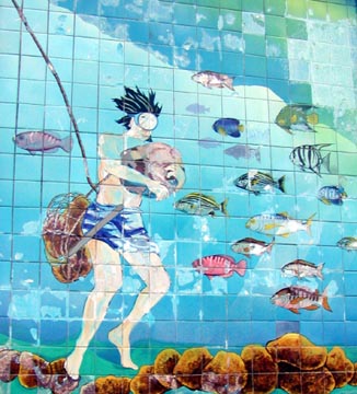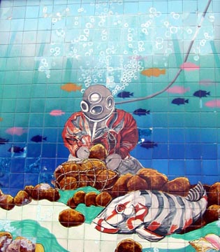 We were walking around the touristy part of the town, looking at kitschy stores, sponges for sale and T-Shirt shops when we passed an aquarium, we heard over a loud speaker on the sidewalk, “The show is about to begin! See our fearless diver enter the tank and hand feed the sharks! Marvel at the force of these prehistoric flesh eating creatures as our diver risks life and limb as sharks swim around him to compete for their meal!” It reminded me of an old RKO MovieTone news reel, it was hilarious. We just HAD to go in and see the show. As we entered the aquarium I saw the diver standing by the door, already in his wetsuit, speaking into the microphone that was broadcasting outside. He was announcing his own show! Pretty funny.
