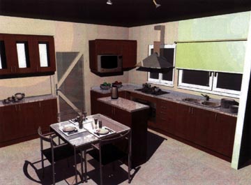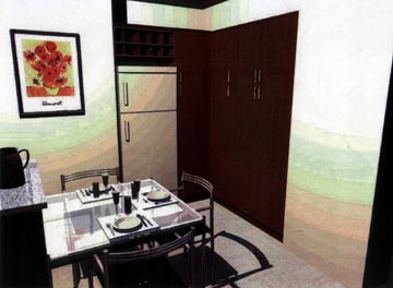 Thursday February 6th, 2003 – We received some 3D graphic pictures of a kitchen design from “Reno”, one of the stores we were getting quotes on for designing the kitchen. At this stage of the remodel the apartment looks like a total wreck, so artist conception pictures of a finished kitchen were wonderful to see as we ooohed and aaahhhed over our future kitchen.