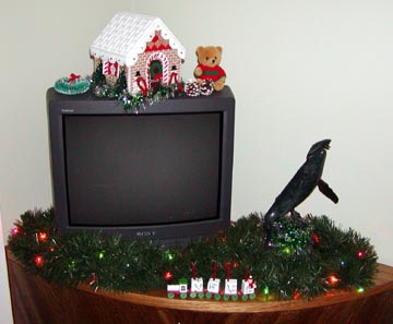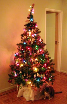Sunday December 7th, 2003 – We finally decided to put the tree up so we could enjoy it for a few days before we left for our Christmas vacation in Chile. The cats were quite happy to see all the boxes to jump in and sniff around. My aunt Hazel had made me a stuffed Christmas mouse that has always been Scarlett’s favorite toy to attack, you should have seen her eyes when I pulled it out of storage. I promptly put the Christmas mouse in the highest possible branch.