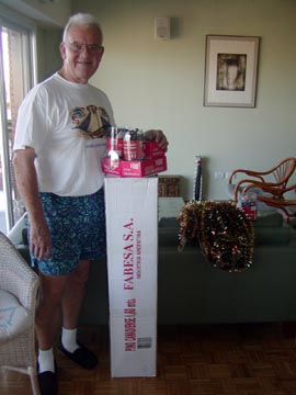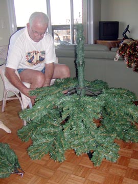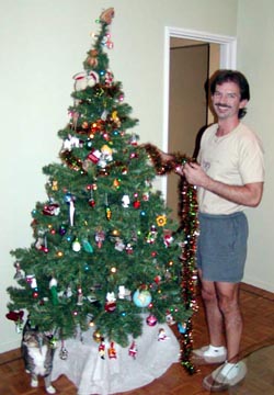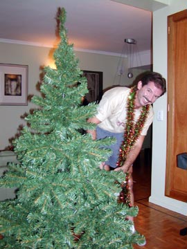 Wednesday December 3rd, 2003 - This is our 4th Christmas here and in the past we’ve never been able to get into the spirit of Christmas because it’s just too damn HOT! All you want to do is sit around in your underwear in front of a fan, not the kind of “nestle up next to the fireplace with a brandied eggnog” kind of feeling, more like “Don’t touch me I’m sweating, bring me a cold beer” kind of feeling. However, with the purchase of the new apartment we shipped down some more personal effects for us including our Christmas ornaments. I was determined to try and make a go of it. We went to “Jumbo” which is our all encompassing “superstore” to purchase a fake tree and 220V lights. They don’t do real trees here, only fake ones. We took the bus to the “Jumbo” store, about a 15 minute trip, it was a typical hot summer day as muggy humid air blew in through the windows, melodies of Bing Crosby’s “White Christmas” were NOT going through my head. We got to the store and found a pretty good display of lights and ornaments, I picked out some cool lights and then found my icicle lights. In California, I told Ron for 10 friggin years that I wanted icicle lights but never got around to buying them before the stores sold out of them, this year I was determined to get my icicle lights. They had a good selection of different sets, but they didn’t say how long they were on the box, only how many lights were included, why should I care if there’s 50 or 100 lights?, I want to know how long they will reach! We made a guess by buying 3 - 150 light sets.