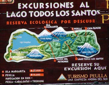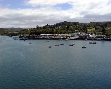 Next we drove 15 km north to Puerto Varas where we were to spend the next two days before our cruise departure. Puerto Varas sits on the edge of Lago Llanquihue, Chile's largest lake at 470 km², with the volcano Osorno standing majestically across the lake from our hotel, just spectacular. After a brief tour of this much smaller town, we were taken to our hotel and Pía pointed out a couple of restaurants not far from our hotel within walking distance. That evening we had a wonderful fish dinner and we were in heaven, the meal was exceptional. Although the day was very clear, the clouds started coming our way during dinner. We didn't think to bring our umbrellas and when we left for the walk back to the hotel it was just "spitting", well, the "spitting" turned into a pretty good downpour before we got back. We were soaked to the skin. Fortunately our room had nice radiant heaters so we just draped our wet clothes over them, and by morning they were dry.
