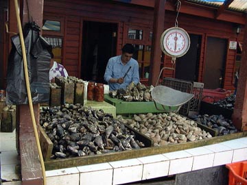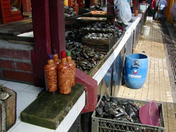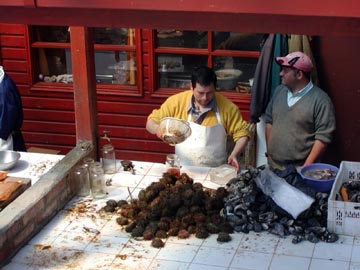 We walked through the fish market, drooling over all the wonderful selections. This one guy was husking sea urchins like you wouldn’t believe, filling huge bottles with them, I wondered if they were going to be shipped off to Japan, although it didn’t look like a commercial kind of setup.