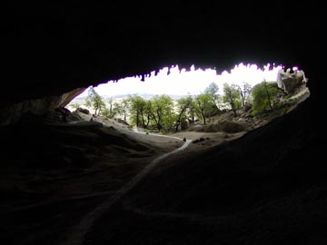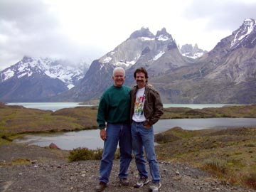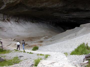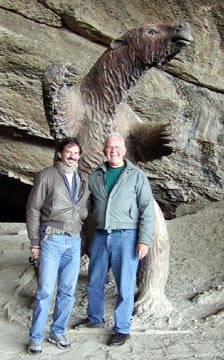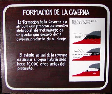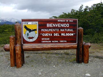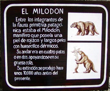 Saturday December 27th, 2003 - Today we had booked an all day excursion to Torres del Paine National Park. It was just the two of us in a van, and our guide spoke excellent English. On the way to the park we stopped off at the Cave of the Milodón, a pre-historic bear that lived in this area some 10,000 years ago. The cave was huge, and it was formed by water action from a lake that was left in this valley after the glacier receded. It's a huge archeological site, and they are still finding bones, of course we had to pose with the statue of the Milodón just as every tourist who visits the cave surely does.
