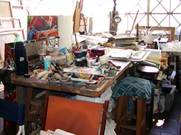 Thursday December 18th, 2003 – Ariel got back to us and arranged a date to meet with the artist so today we went to visit Juan Carlos Lasser’s studio in the barrio called Almargro. FANTASTIC! His studio is a wonderful space of light, breezes, mature trees swaying outside the windows and all sorts of artist stuff crammed EVERYWHERE!