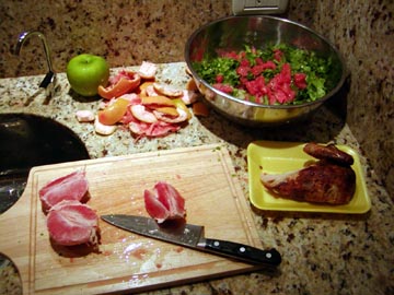 Wednesday June 16th, 2004 - We celebrated our 22nd anniversary tonight by ordering Chinese food delivered. Ron and I both had a miserable winter cold and neither of us felt like going out. We still cheered our good fortune and life with wine!Saturday June 19th, 2004 - We have a nice local restaurant that we often have dinner delivered. Ron loves their “ensalada diet” which has white chicken breast, grapefruit, celery and green apples in it. Ron started making it all the time and was explaining it to a friend and how to make it, so he figured a picture is worth a 1,000 words so he took some snaps.