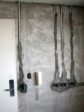 The poor mason, every time he builds a wall someone comes along and chisels a hole in it. These are water pipes for the guest toilet sink.