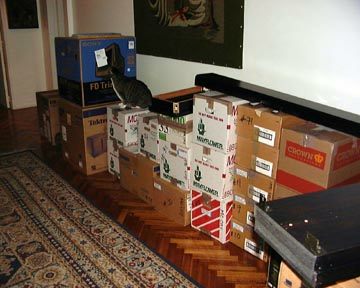 Now the fun part came, we started to unbox things and discover what we really brought. Ah, my electronic piano! Ah, my music CDs! Ah, my books! Oh boy, the DVD player! WHAT?!?!? Who put all this cat food in here?? Scarlet!!! Loretta!!! Did you do this? I can’t believe we shipped an entire box filled with cat food! Well, at least we won’t have to buy any more cat food for one or two weeks!