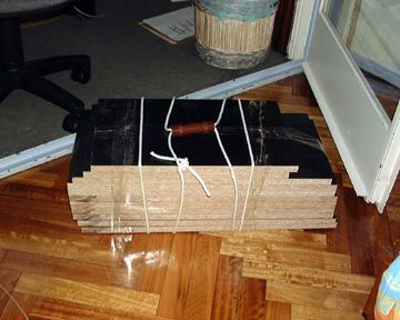 This is the bundle of wood that Ron bought for his shelf project. Ron designed the handle mechanism to carry the wood home on the bus.