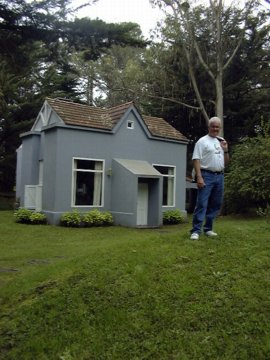 Ron is on a hill in front of the house but the perspective makes him looker larger then the house!