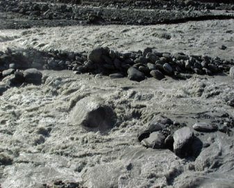 Glacier runoff milk, it's grey from the ground up rockand those are chunks of ice flowing down the river.