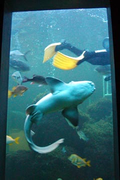 Sure enough, he climbed into the tank and it was fun to watch him feed the fish and the sharks, the fish slowly circling him, knowing they’re about to be fed, looking more like our fat lazy pussy cats waiting for their dinner then prehistoric flesh eating fish.