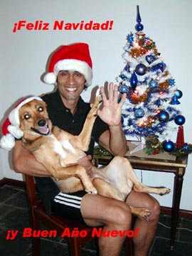 Saturday December 6th , 2003 – Alberto asked me if I could take a Christmas picture for him like I did last year. I helped him setup his tree and then put a santa hat on his dog Eva!