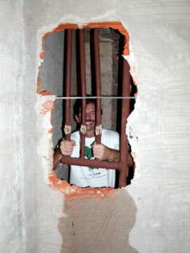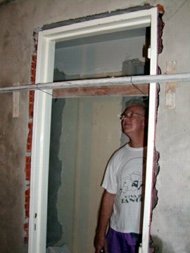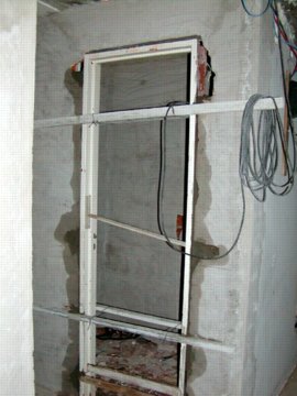 More high tech carpenter tools, these are old boards that have been tied together with wire to form a vise to hold the door frame in place while the concrete dries.