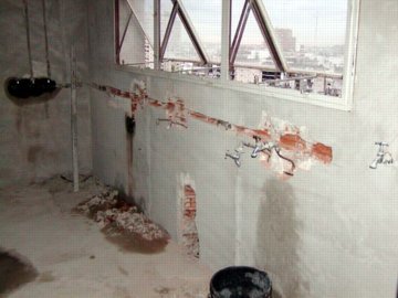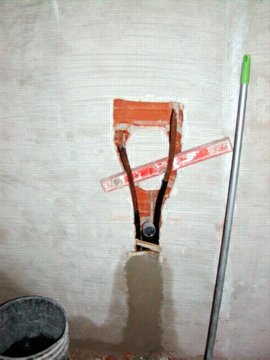 The poor mason, every time he builds a wall someone comes along and chisels a hole in it. These are water pipes for the guest toilet sink.